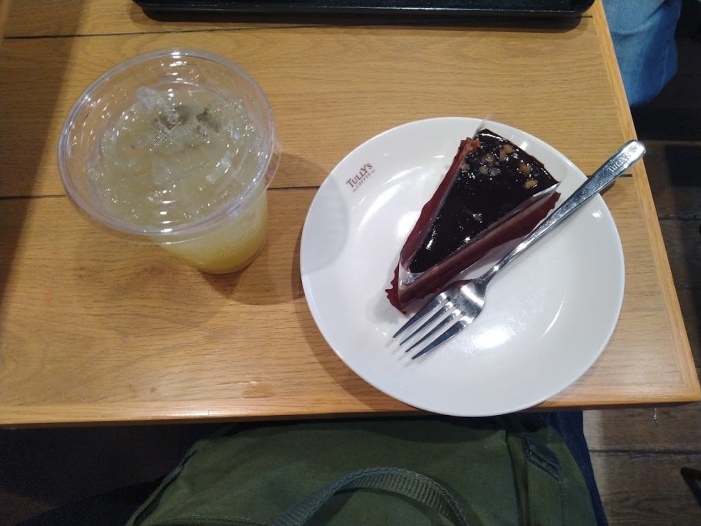 その後、NGKの下にあるタリーズでケーキとりんごジュースを注文しました。