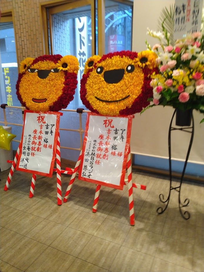 食べた後、NGKに向かいました。新座長のアキ座長・吉田裕座長をお祝いする花が飾られていました。