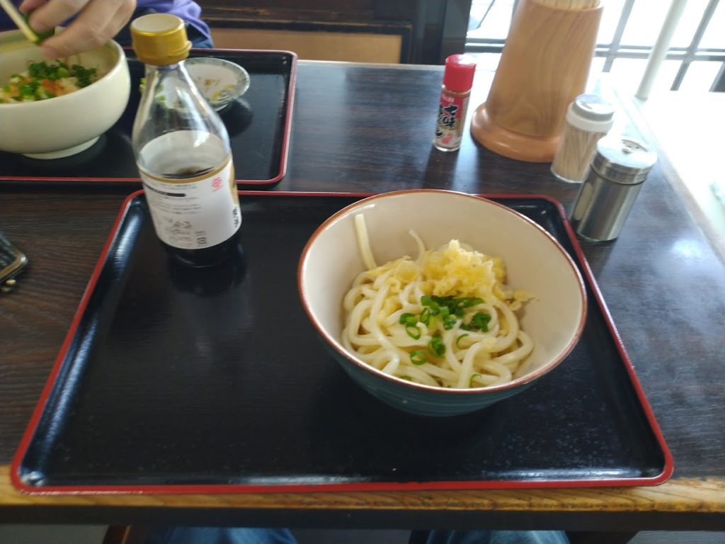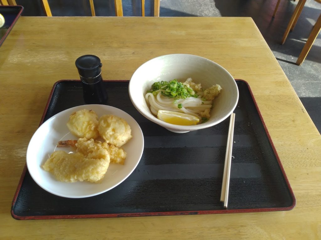 ここでは「生じょうゆうどん、卵天、えび天、イカ天」を食べました。