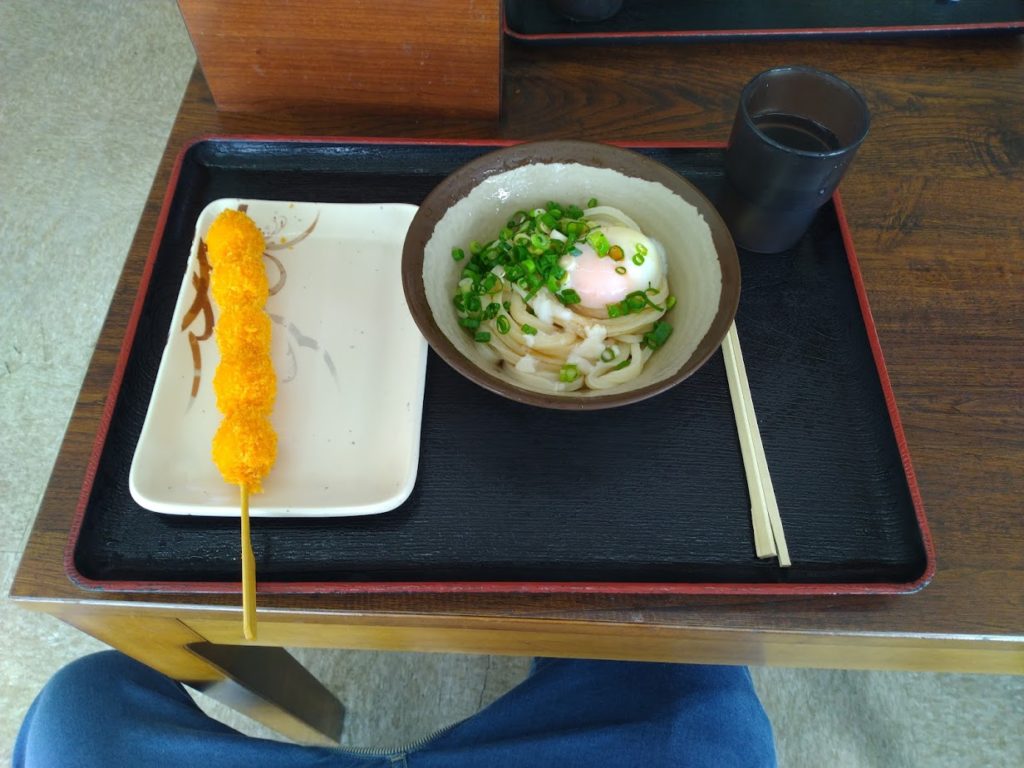 ここの店では「しょうゆ温泉うどん、うずら卵天」を食べました。