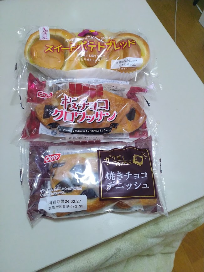 ここで買った商品は「焼きチョコデニッシュ、板チョコクロワッサン、スイートポテトブレット」に行きました。
