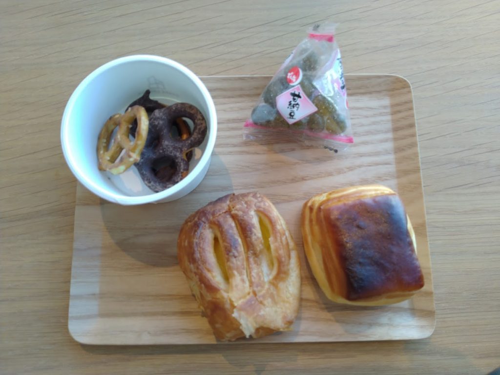 僕は「りんごジュース、ダークチョコレートコーヒーアーモンド、プレッツェルダークチョコレート、プレッツェルミニソルト、甘納豆、パン(2)」を食べました。