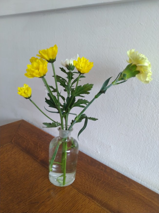僕が座った所に花が置いてありました。