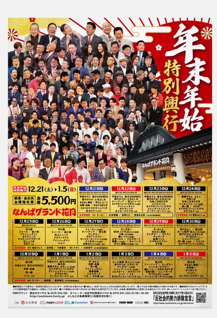 どの劇場も豪華メンバーが出演しますね〜。皆様、笑い納めは吉本劇場の年末年始特別興行を見に行ってみてください。