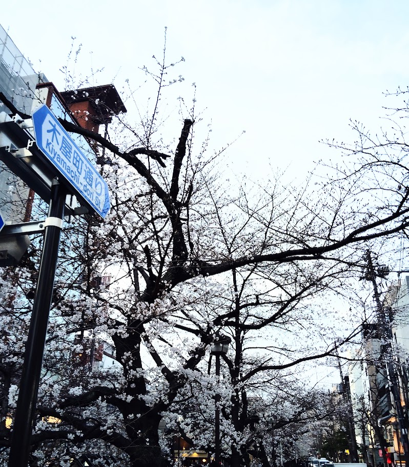 まず終点の河原町駅で降りて歩いて向かっている途中に四条通りで綺麗な桜が咲いていました。